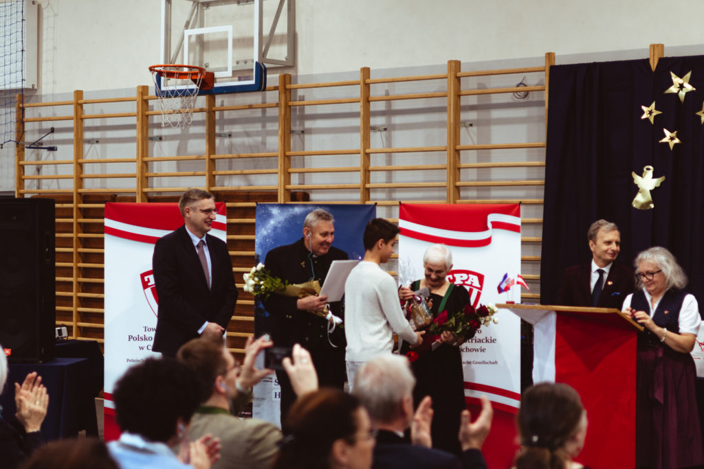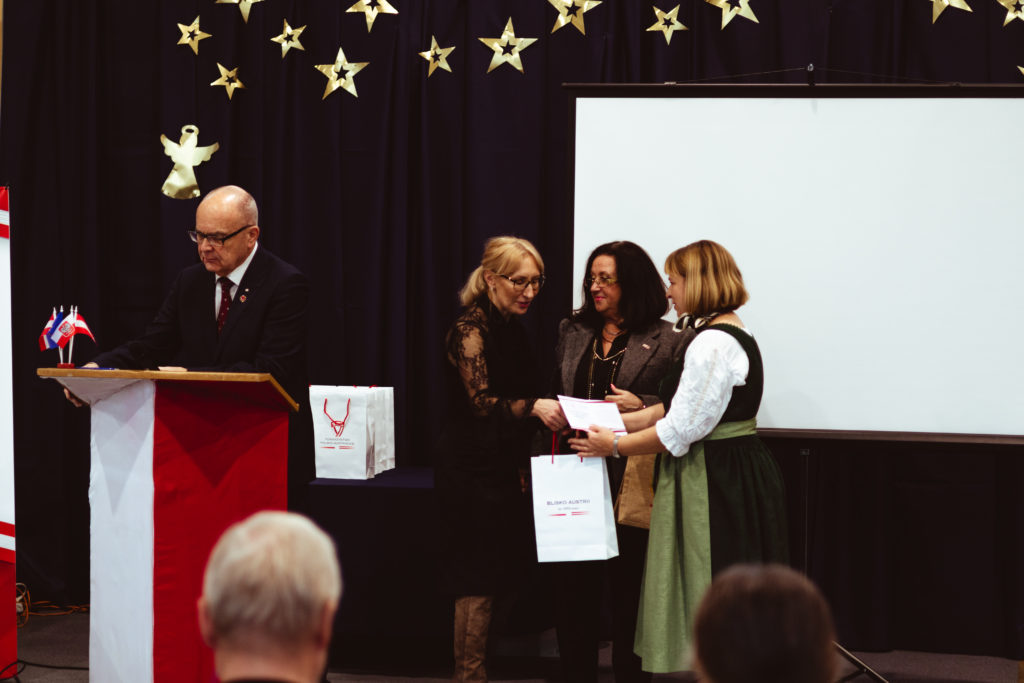 Pan Janusz Gast – Prezes ZG TPA w Warszawie, pani dr Anita Kwecko- Podświadek – Sekretarz Generalna ZG TPA w Warszawie oraz pani dr Marta Kościelecka – skarbnik ZG TPA w Warszawie dokonali aktu udekorowania osób uhonorowanych złotą odznaką z laurem „Zasłużony dla Towarzystwa Polsko-Austriackiego”:
