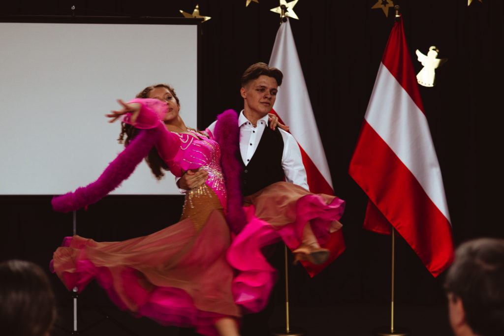 Uczennice i uczniowie klas tanecznych SP nr 38 zaprezentowali się w walcu wiedeńskim, a p. Kamil Polewski – dyplomowany nauczyciel tańca – poprowadził także kurs tego tańca dla zaproszonych gości.