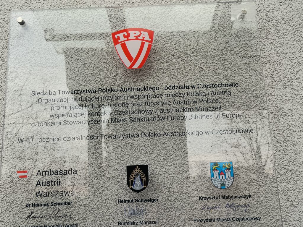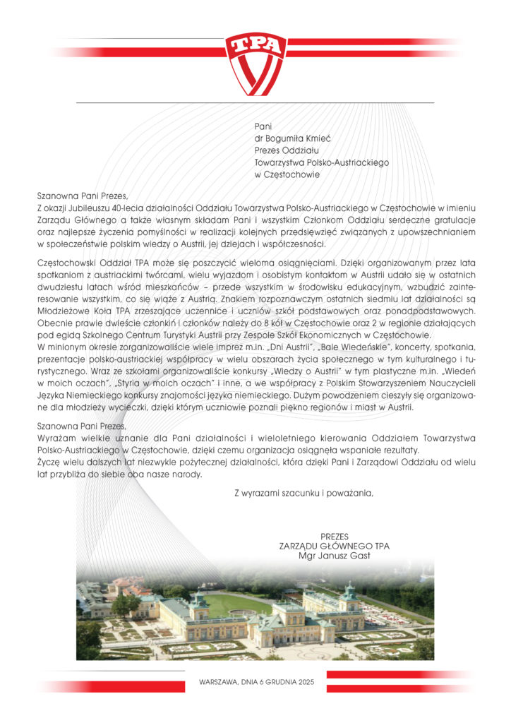 Proszę przyjąć wyrazy mojego szczerego uznania dla całego Zarządu Głównego oraz członków Polsko-Austriackiego Towarzystwa w Częstochowie, a także życzenia dalszych sukcesów w realizacji Państwa szlachetnej misji.